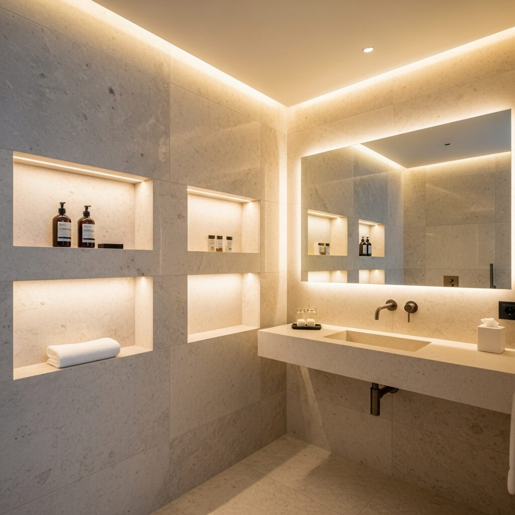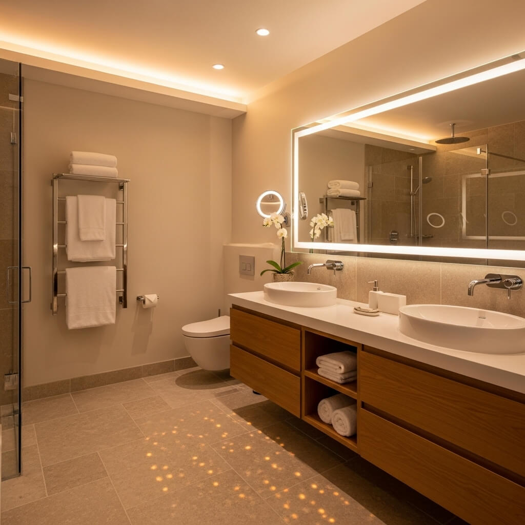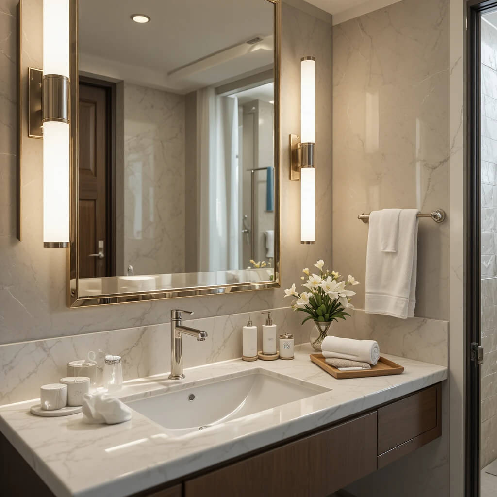 Lighting is one of the most overlooked elements in home bathrooms, yet it’s one of the most important in luxury hotels. Instead of relying on a single overhead light, hotels use layers of lighting to create mood and functionality.