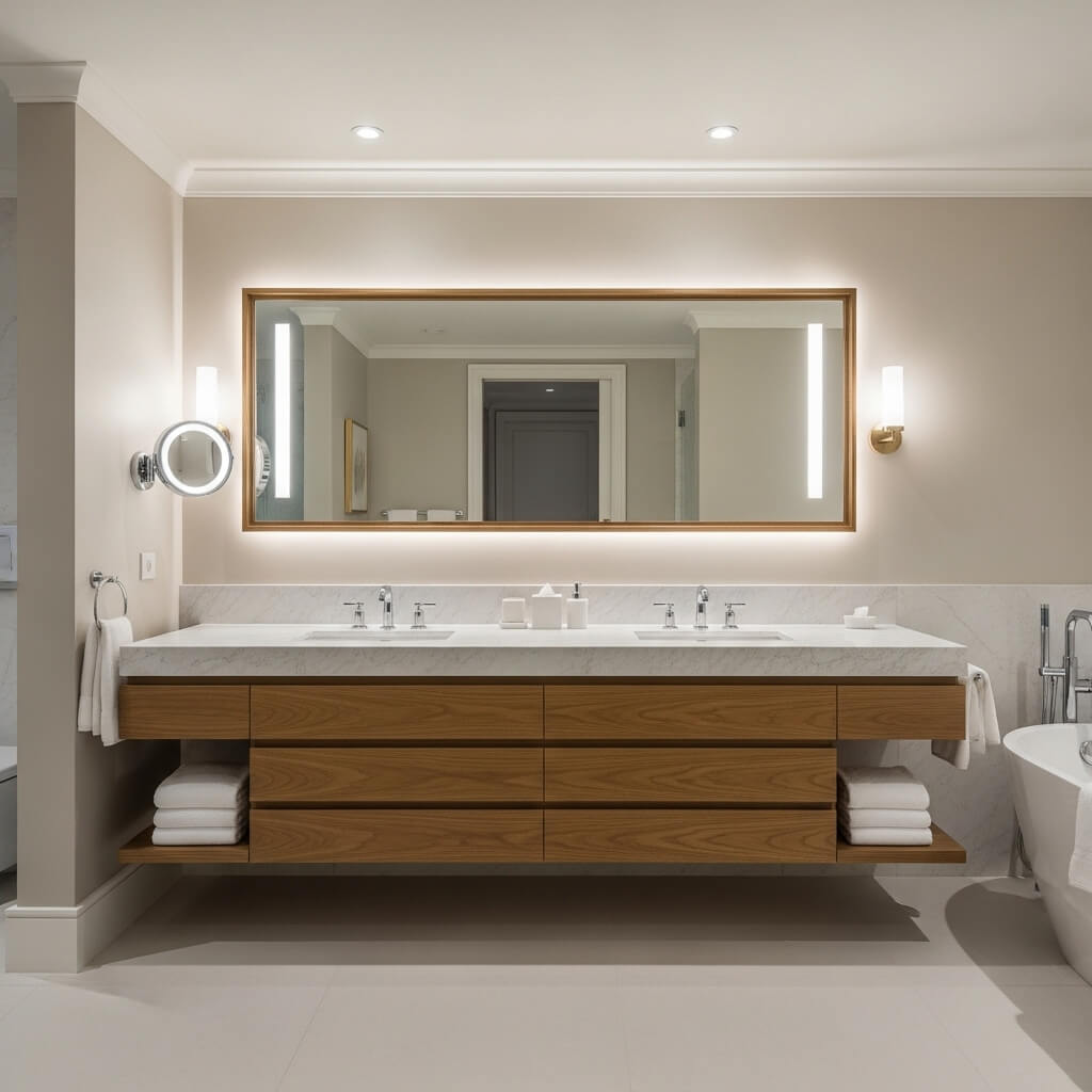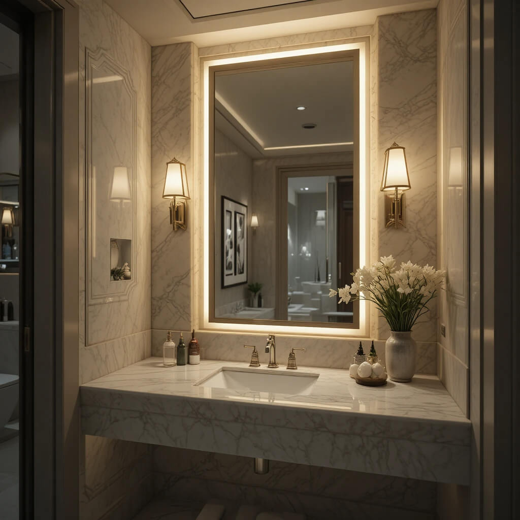 Wall sconces and backlit mirrors are especially popular in hotel-style bathrooms. Choose warm light temperatures to avoid harsh shadows and create a soft, flattering atmosphere.