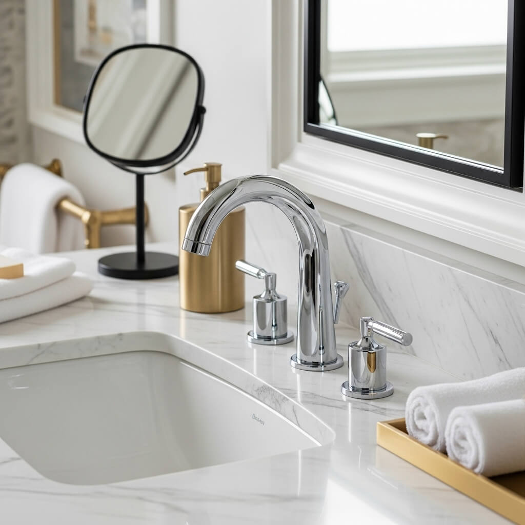 Stick to one or two finishes for a cohesive look. Consistency is what makes hotel bathrooms feel intentional and refined.