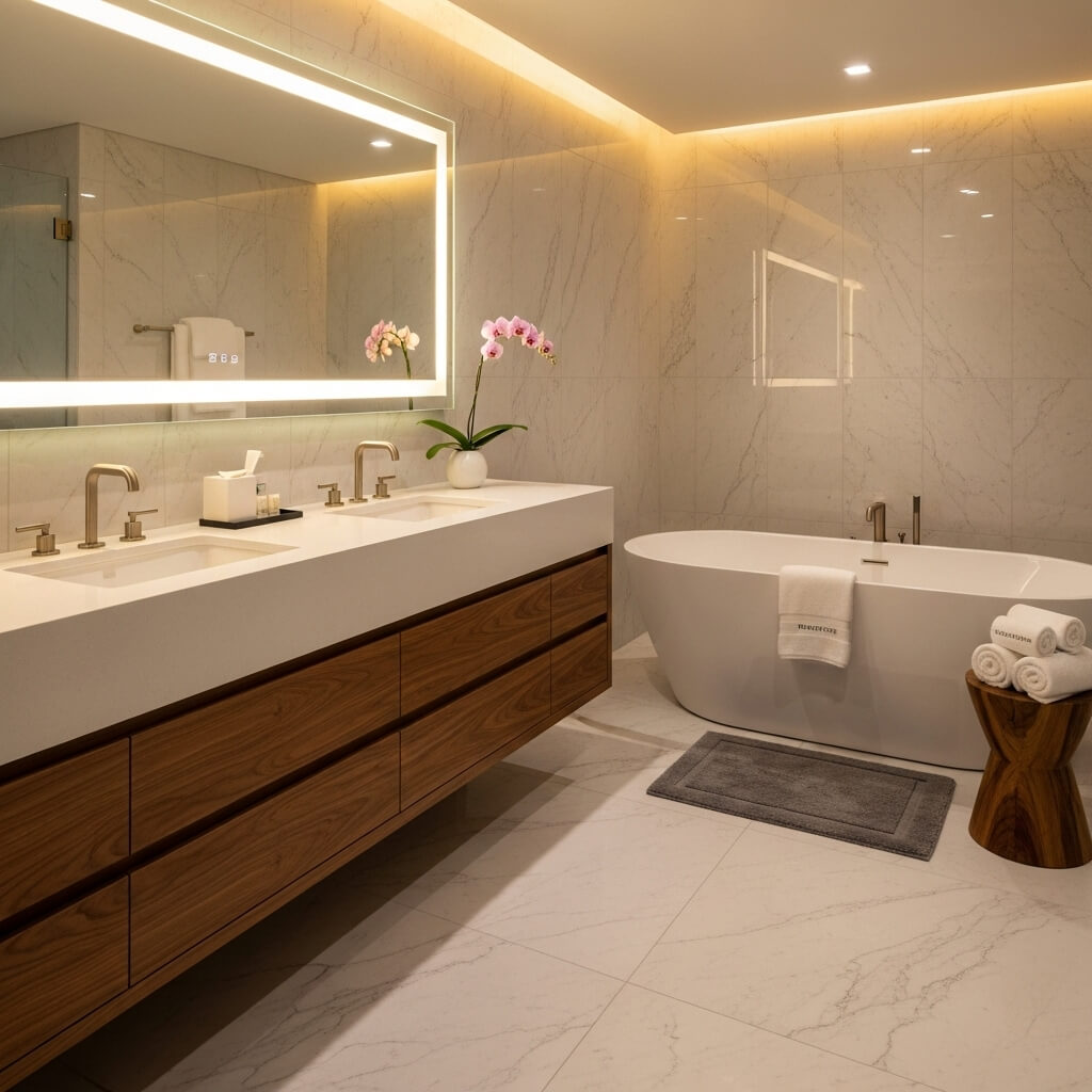 A luxury bathroom isn’t about excess—it’s about intention. Five-star hotel bathrooms feel special because every detail is considered, from lighting to layout to textures.