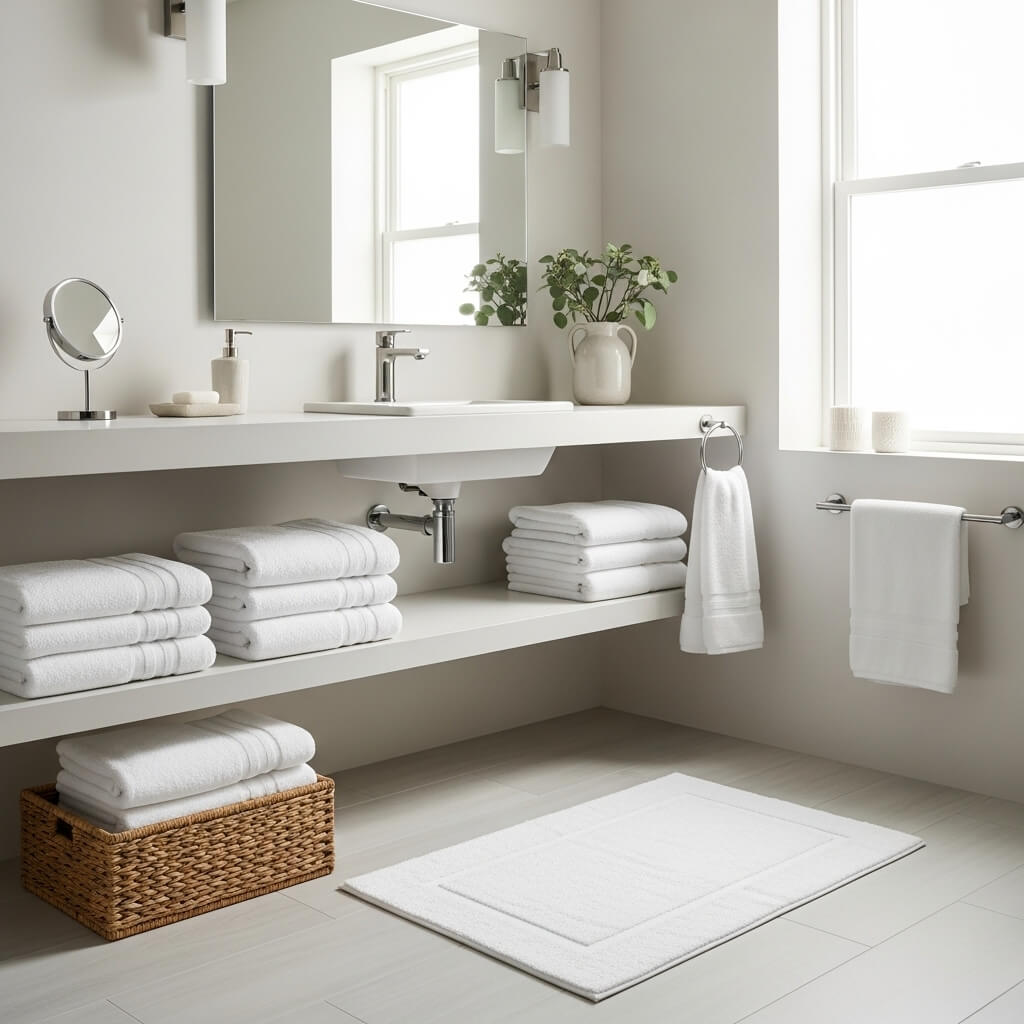 Roll towels neatly or stack them on open shelves for that spa-inspired look. Consistency in color is key—hotels rarely mix bold shades in towels.