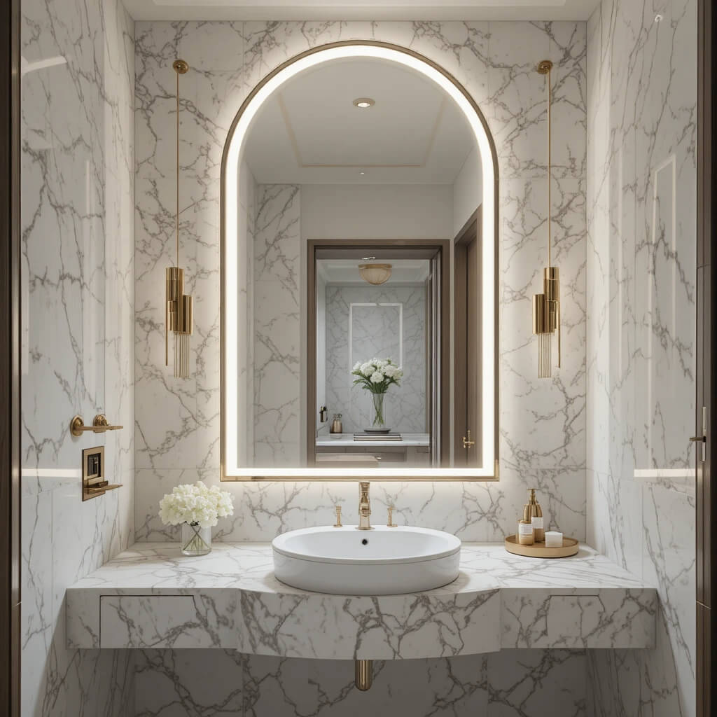 Backlit mirrors add a modern, upscale glow and eliminate the need for extra lighting. For added personality, consider arched or softly rounded mirror shapes, which feel elegant and on-trend.