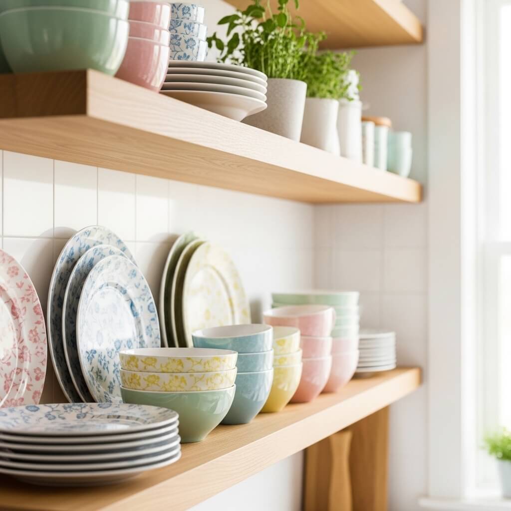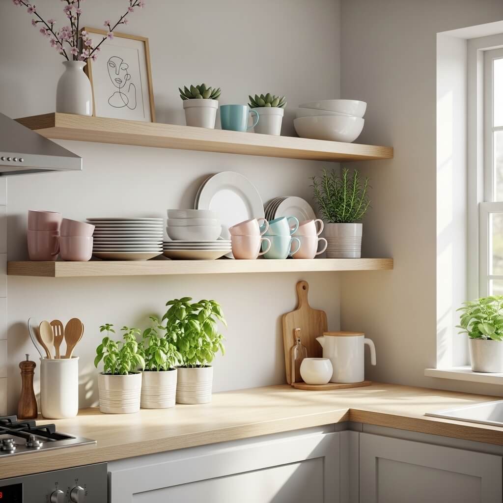 Swap out darker ceramics for white or pastel dishware. Add small plants, glass jars, or woven baskets for texture. Keep negative space between items so shelves feel breathable.