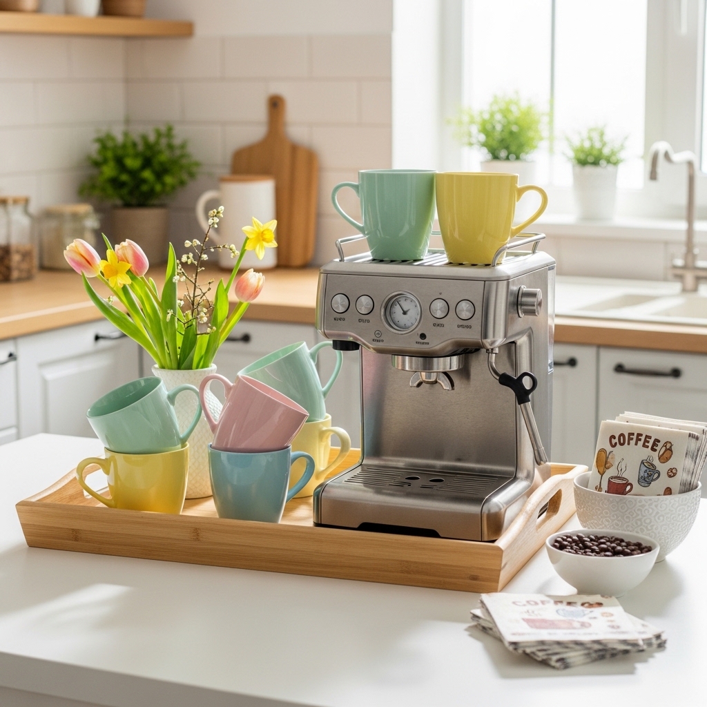 Spring is a great time to refresh your coffee or beverage station. Add floral mugs, a small plant, or pastel accessories to give it a seasonal feel.