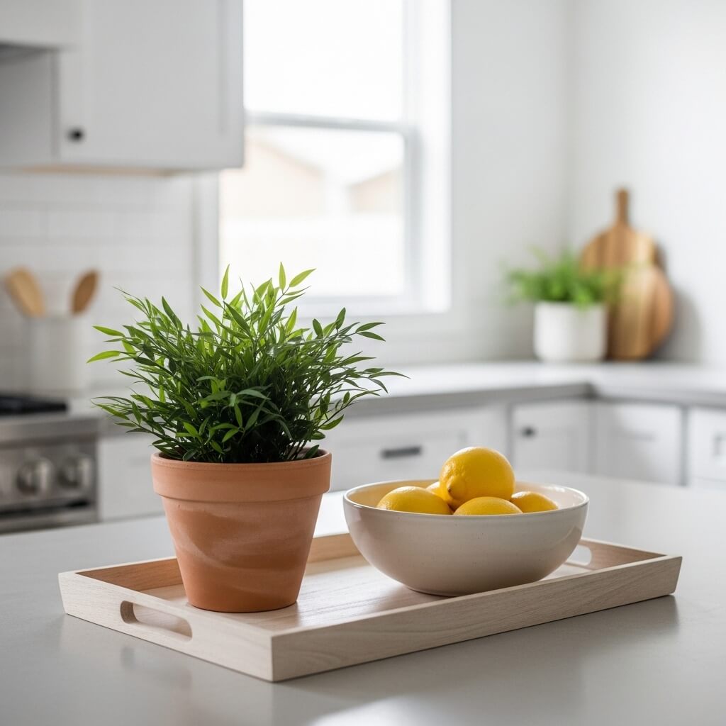 A small tray with a candle and plant, a ceramic fruit bowl, or a simple vase can make countertops feel considered without sacrificing usability.