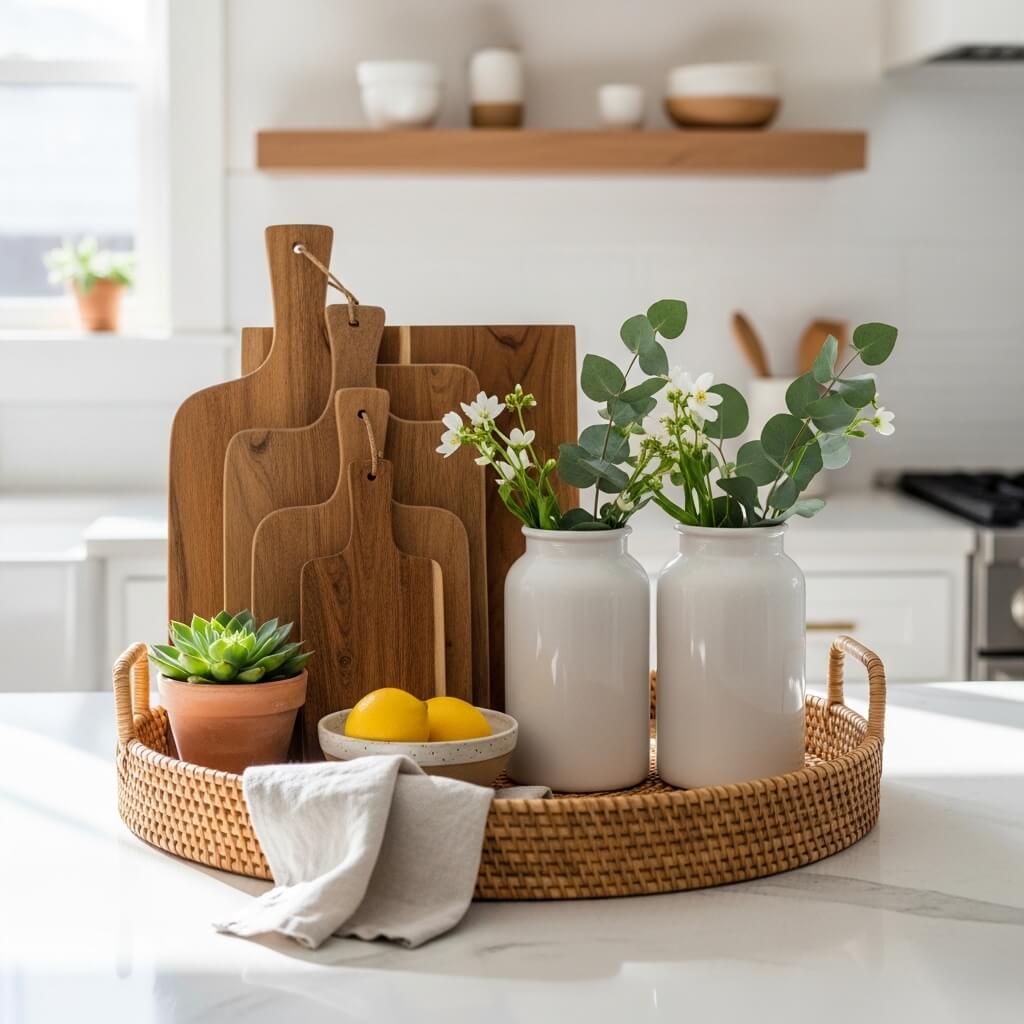 Use a woven tray to corral oils or coffee essentials on the counter. Display wooden cutting boards as functional décor. These elements balance modern finishes and prevent kitchens from feeling too sterile.